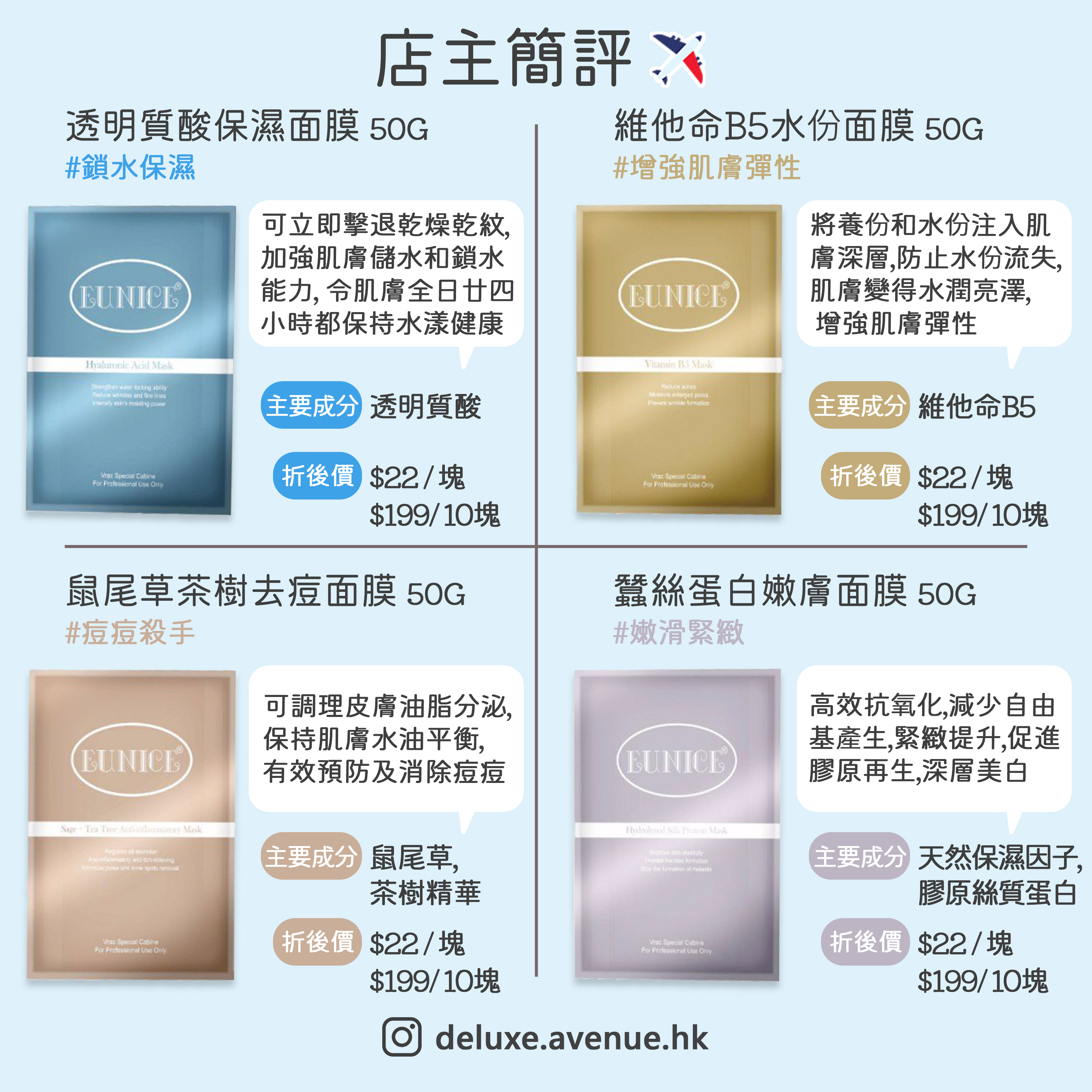 😍😍繼爆單200片的Eunice 膠原急救面膜,🤩店主再引入多9️⃣款Eunice不同功效面膜,俾大家按肌膚需求選購,👆🏻全部Eunice 系列面膜均為無香料及全天然成份,適合敏感肌使用😌